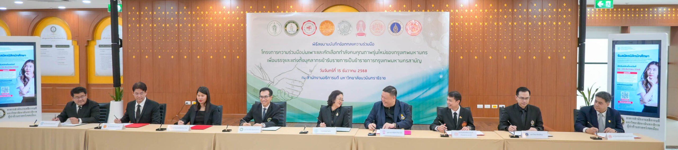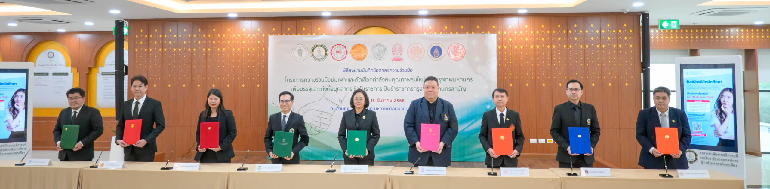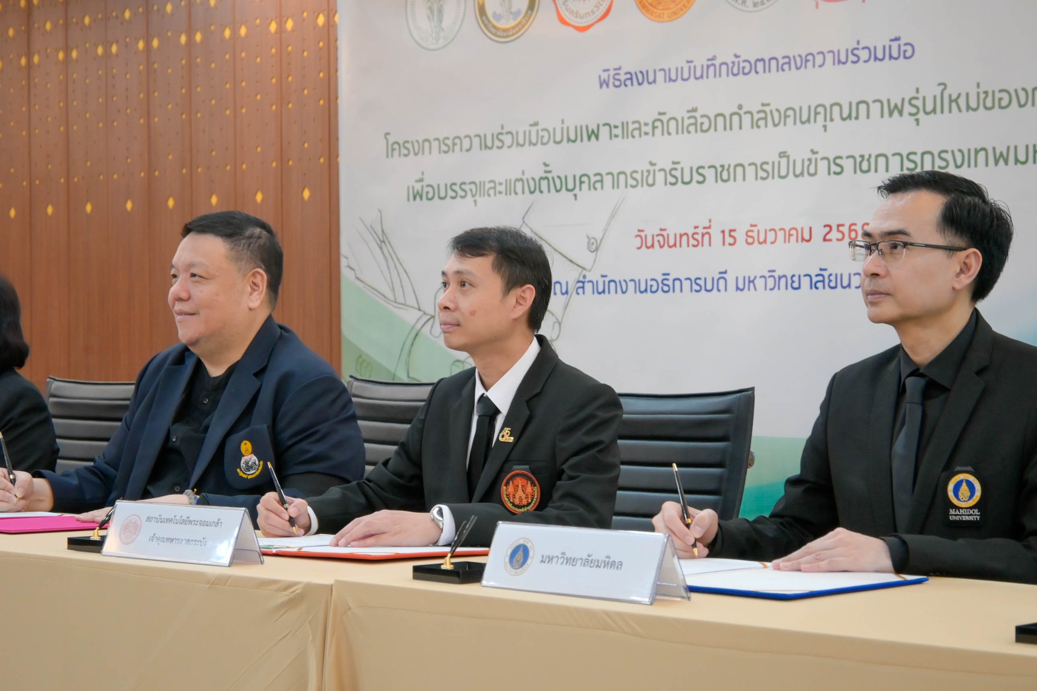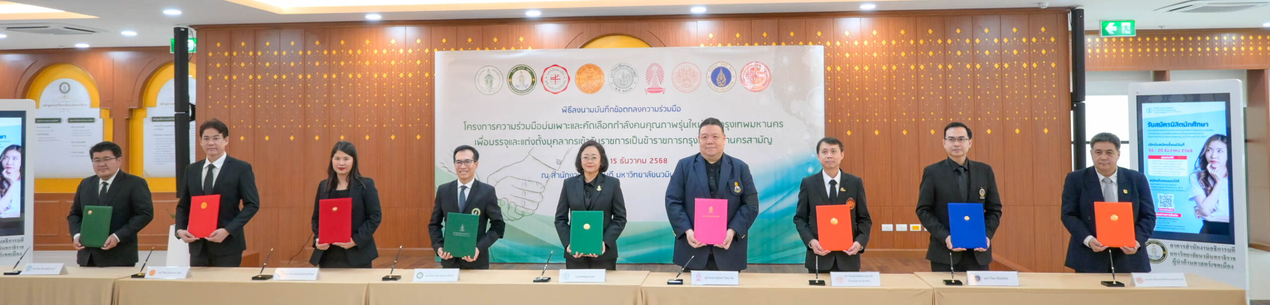 15 ธ.ค. 2568 สถาบันเทคโนโลยีพระจอมเกล้าเจ้าคุณทหารลาดกระบัง (สจล.) โดย รองศาสตราจารย์ ดร.ราชศักดิ์ ศักดานุภาพ ผู้ช่วยอธิการบดีฝ่ายวิชาการและประกันคุณภาพการศึกษา ผู้แทนอธิการบดี ร่วมลงนามบันทึกข้อตกลงทางวิชาการ พร้อมด้วยตัวแทนจากทั้ง 8 หน่วยงาน ได้แก่ 1) กรุงเทพมหานคร 2) มหาวิทยาลัยนวมินทราธิราช 3) มหาวิทยาลัยศรีนครินทรวิโรฒ 4) มหาวิทยาลัยธรรมศาสตร์ 5) มหาวิทยาลัยเกษตรศาสตร์ 6) จุฬาลงกรณ์มหาวิทยาลัย 7) มหาวิทยาลัยมหิดล และ 8) มหาวิทยาลัยเทคโนโลยีพระจอมเกล้าธนบุรี